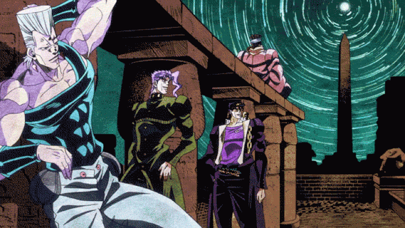 phantom blood: the core four, as well as bruford <3battle tendency: suzi q, lisa lisa, and caesarstardust crusaders: kakyoin, abdul, polnareff, jotaro, iggy, and n'douldiamond is unbreakable: the josuyasu duo, mikitaka, reimi, tonio, and shizukavento aureo: narancia, giorno, bruno, + fugo